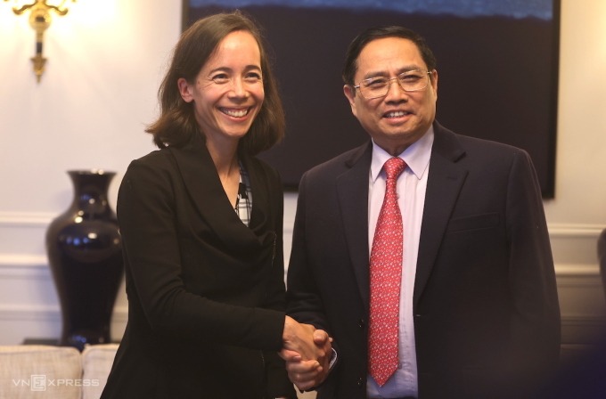 Thủ tướng Phạm Minh Chính tiếp bà Aurélia Nguyen, Giám đốc điều hành Chương trình Tiếp cận vaccine toàn cầu Covax. Ảnh: Võ Thành