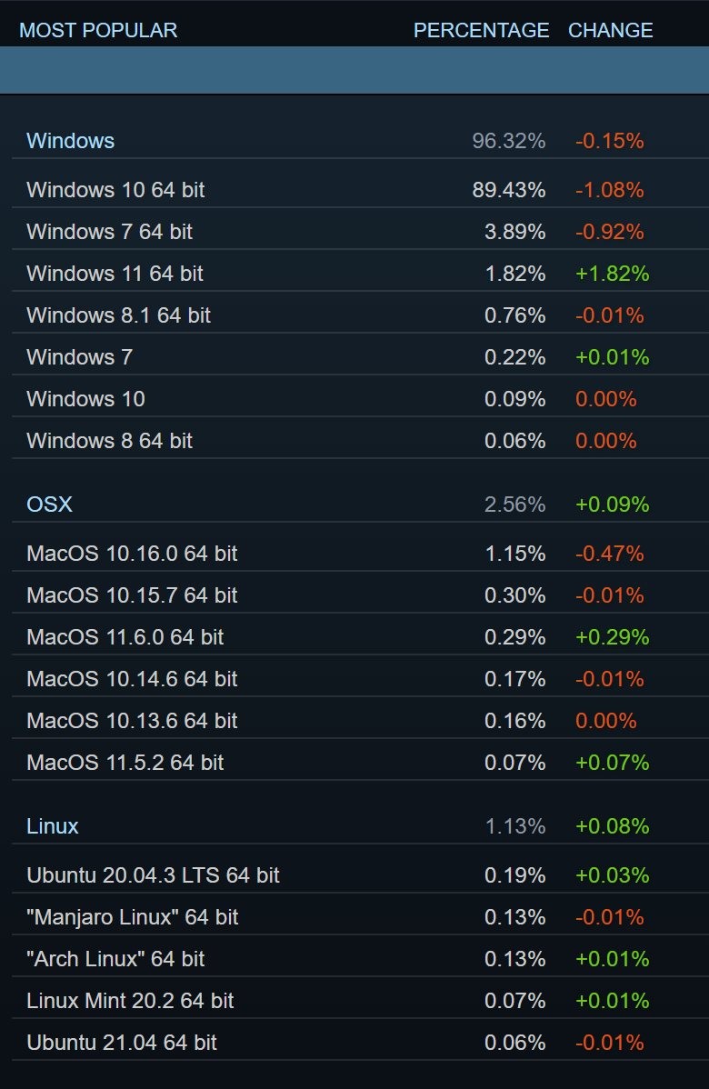 Windows 7 64-bit đứng thứ hai với 3,89%, trong khi Windows 11 64-bit được phát hành gần đây hiện đứng thứ ba với 1,82%.