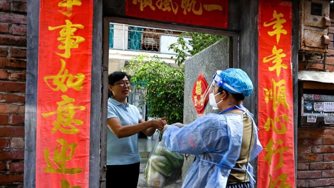 Nhân viên hỗ trợ cộng đồng ở Thụy Lệ đưa nhu yếu phẩm đến nhà dân trong đợt phong tỏa chống Covid-19. Ảnh: Xinhua.