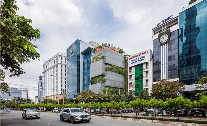 Cây cối trồng xung quanh mang đến không gian xanh cho toàn bộ tòa nhà cao tầng.