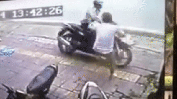 Khi đang loay hoay dắt xe ra để nổ máy bỏ chạy thì cùng lúc này, nam chủ nhà phát hiện và phi ra "tung cước" đạp tên trộm ngã lăn ra đường.