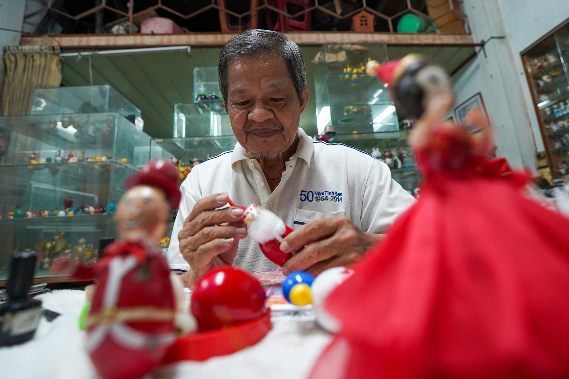 Nhắc về sản phẩm đầu tiên, ông Tâm nhớ lại: “Lúc đó tôi dạy một em học lớp 8 bài giảng về ông già Noel. Không có mô hình để thị phạm, ngồi quan sát con lật đật, với cái bầu tròn tròn của phần đầu và phần bụng, tôi liên tưởng đến ngay những chiếc vỏ trứng. Đó là sản phẩm đầu tay của tôi”.