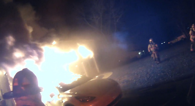 Ngọn lửa bùng lên từ chiếc Tesla đang đậu ngoài sân (Ảnh: Sở cứu hỏa Fort Washington).