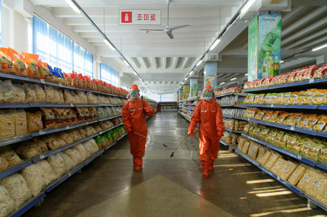 Nhân viên phun thuốc khử trùng để chống dịch Covid-19 tại cửa hàng bách hóa Yokjon ở thủ đô Bình Nhưỡng hôm 20/10 (Ảnh: AFP).