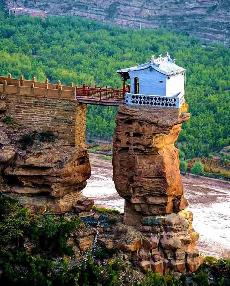 Có một cây cầu nối 2 ngôi chùa với nhau, bên dưới là vực sâu hun hút. Để leo lên được ngôi chùa này, mọi người phải vượt qua hàng nghìn bậc thang thẳng đứng bám vào vách đá.