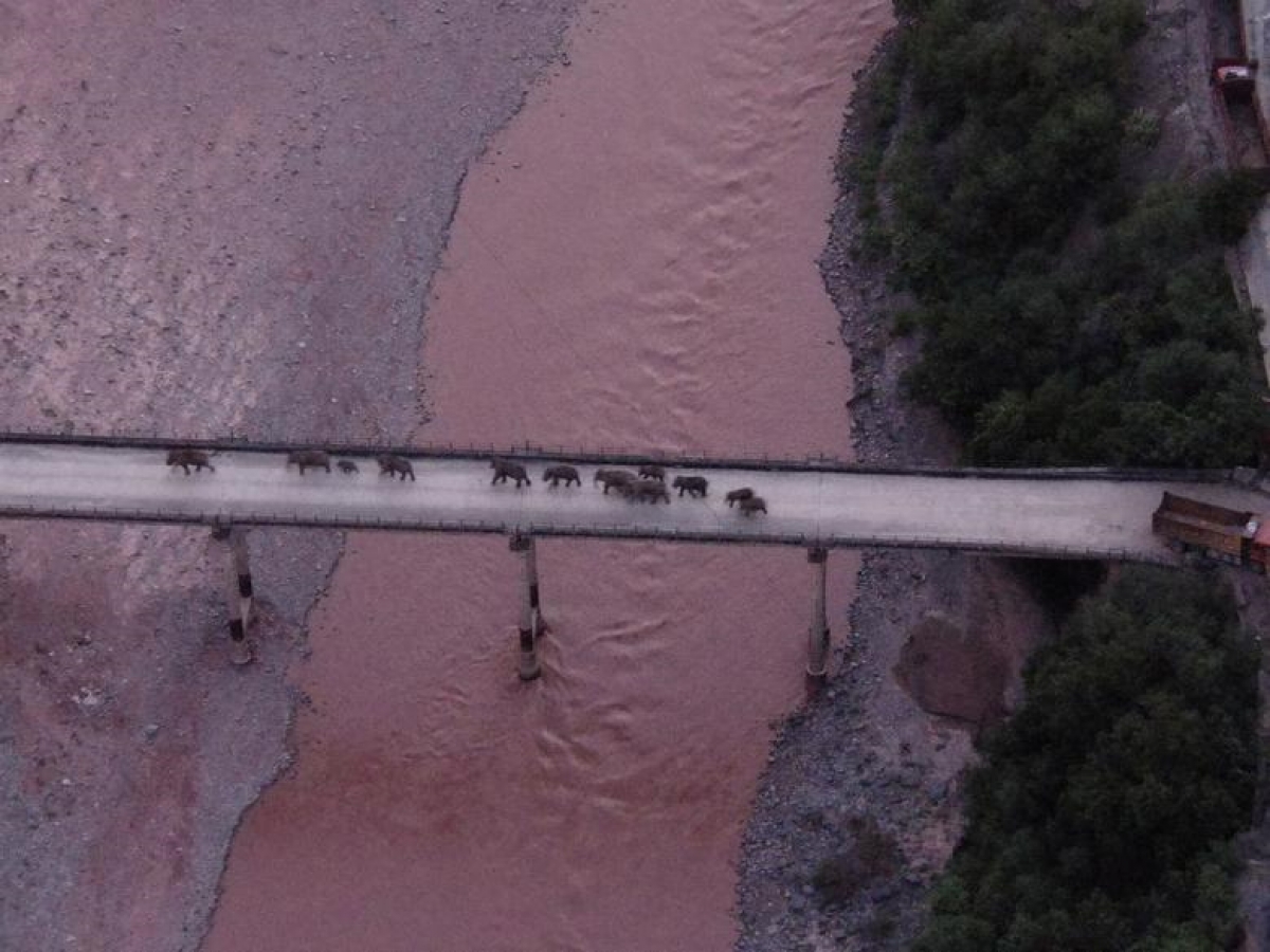 Đàn voi băng qua cây cầu bắc qua sông Yuanjiang, tỉnh Vân Nam, Trung Quốc, ngày 8/8/2021.