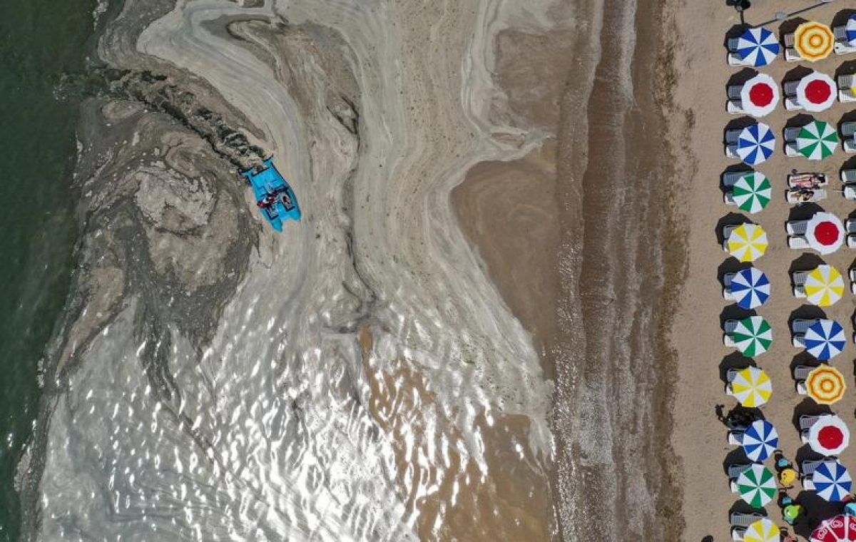 Hình ảnh nhìn từ trên cao một bãi biển vắng vẻ ở Istanbul, Thổ Nhĩ Kỳ ngày 12/6/2021. Có thể nhìn thấy rõ lớp dày chất hữu cơ, còn được gọi là chất nhầy biển, tràn qua Biển Marmara và gây ra mối đe dọa đối với sinh vật biển và ngành đánh bắt cá.