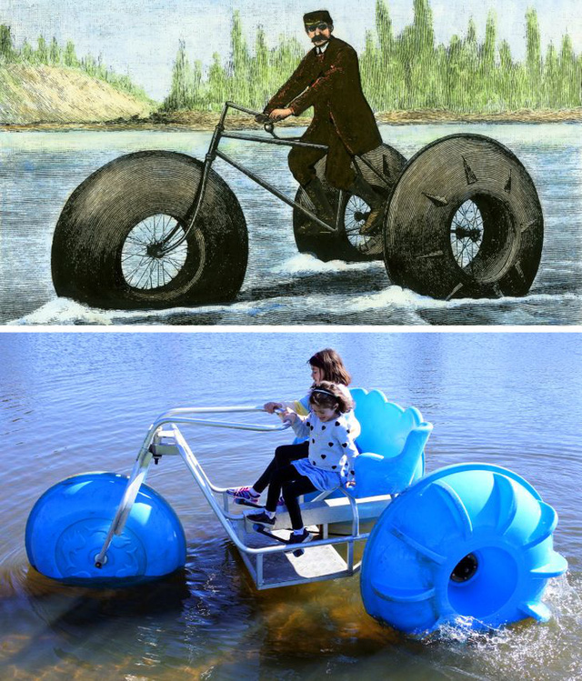 Hóa ra, xe đạp nước đã được phát minh vào khoảng năm 1890. Cỗ máy này bao gồm 3 bánh xe rỗng, chứa đầy không khí với các mái chèo cố định bên ngoài. Nhà phát minh ra nó đã cố gắng vượt qua eo biển từ Anh tới Pháp. Khoảng cách chỉ khoảng 40km, nhưng thử thách vẫn khá khó khăn cho việc điều hướng không dễ vì cỗ máy quá nhỏ.