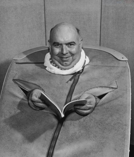 Thay vì vận động, nhiều người muốn đổ mồ hôi một cách nhẹ nhàng hơn và đó là lý do các bộ đồ xông hơi khô di động đang là xu hướng ngày càng gia tăng. Nhưng hóa ra chúng đã thực sự được phát minh ra từ rất lâu. Bên trái là hình ảnh người đàn ông vừa đọc sách vừa đổ mồ hôi trong thiết bị tắm hơi di động, được chụp vào năm 1955, là minh chứng cho điều đó.