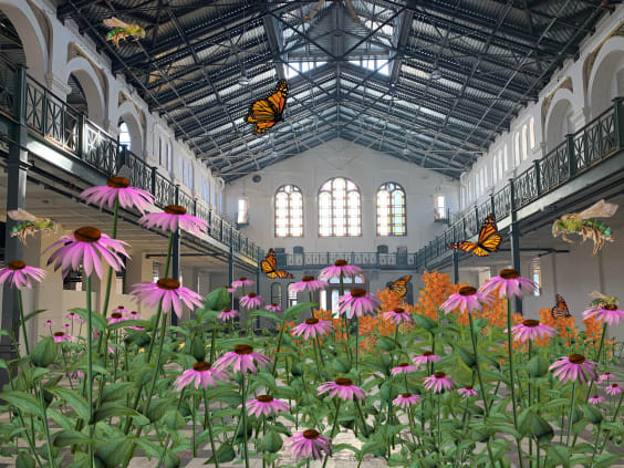 Điều gì sẽ xảy ra nếu thủ đô nước Mỹ trở thành một hệ sinh thái hoang dã? Câu hỏi đó là cơ sở cho dự án thực tế tăng cường (AR) của nghệ sĩ Tamiko Thiel, người đã biến một trong những phòng triển lãm thành một môi trường sống của hoa dại.