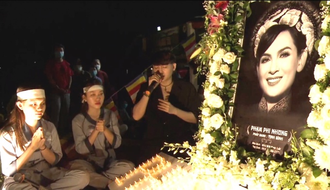 Hai người con gái nuôi của Phi Nhung là Thiêng Ngân và Tuyết Nhung đội khăn tang, vừa khóc, vừa hát bằng giọng đứt quăng. Khiến nhiều khán giả xúc động. Những con nuôi c̣n lại của giọng ca Bông điên điển ngồi xung quanh, vừa chắp tay vái, vừa tụng kinh cầu nguyện trước di ảnh mẹ. Sau đó, họ cùng thả hoa đăng trên sông.