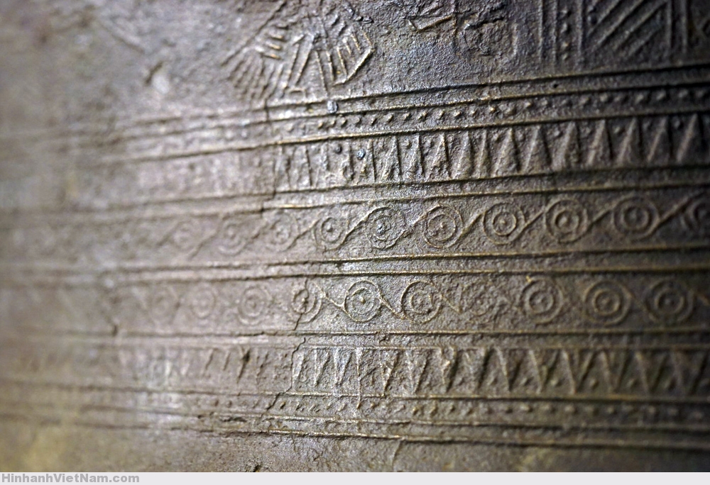 Phần dưới của thân là ba vành hoa văn hình học, giữa là vành văn vòng tròn chấm giữa có tiếp tuyến. Hai bên là hai đường chấm nhỏ. Ngoài cùng là hai đường chỉ trơn. Chân trống không có trang trí.