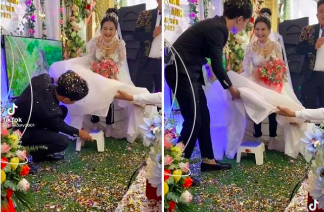 Chú rể phải lấy thêm ghế để cô dâu đứng lên cho cao, cô dâu vén váy khiến khách vô tình nhìn thấy thứ bên trong chiếc váy.
