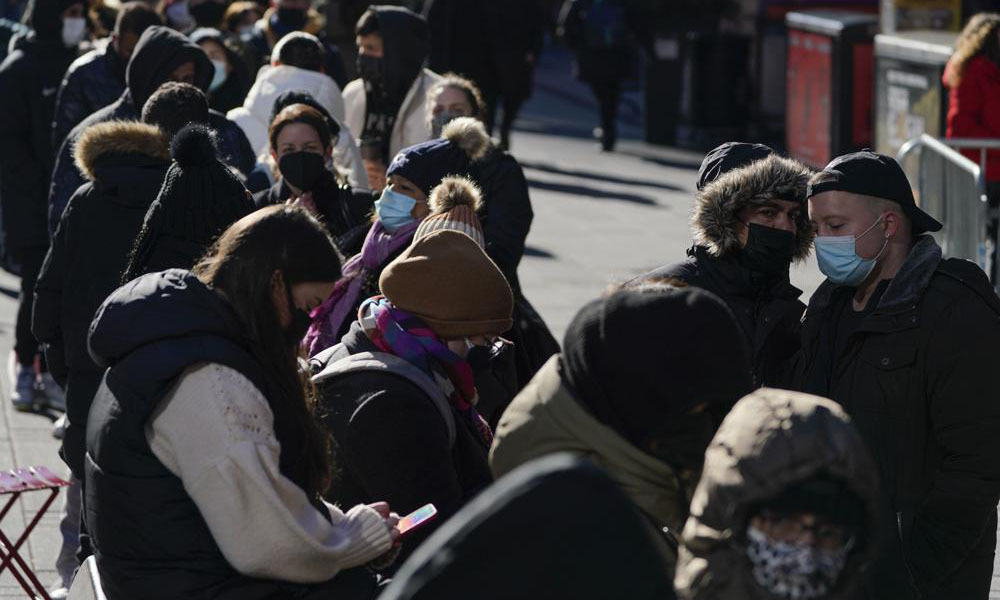 Người dân xếp hàng chờ xét nghiệm nCoV tại Quảng trường Thời đại ở New York, Mỹ, hôm 20/12. Ảnh: AP.