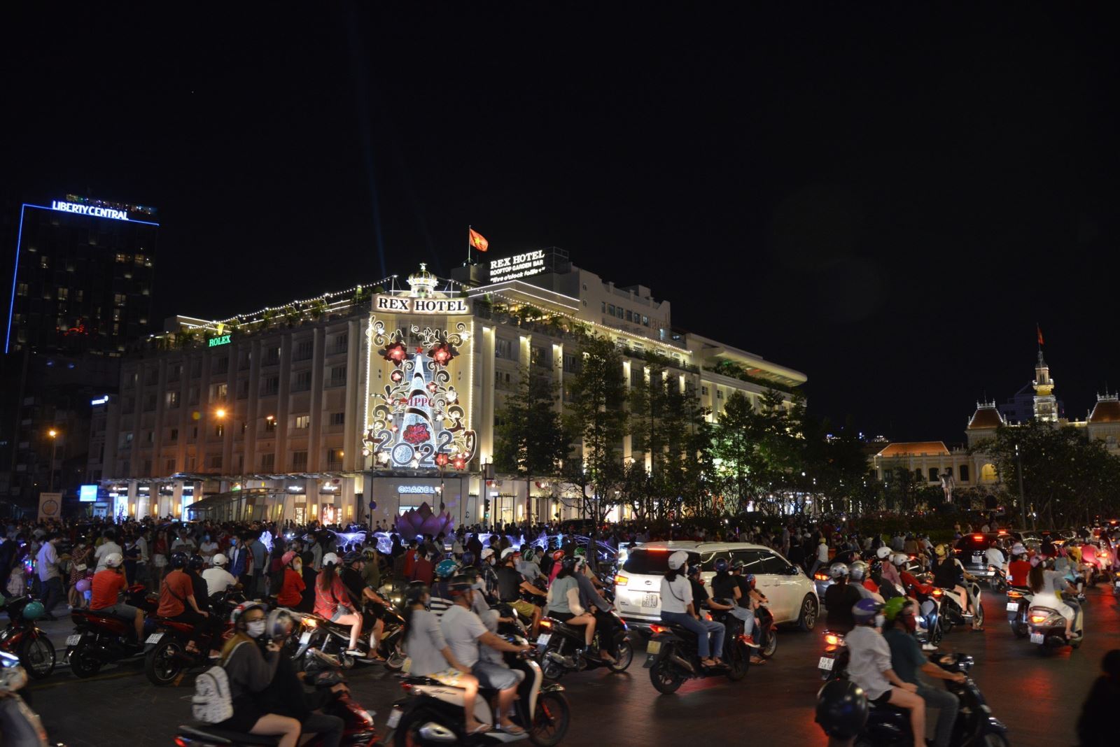 Tại khu vực phố đi bộ Nguyễn Huệ, dòng người đi chơi cũng tăng lên từng giờ khiến khu vực này cũng xảy ra tình trạng ùn ứ kéo dài.