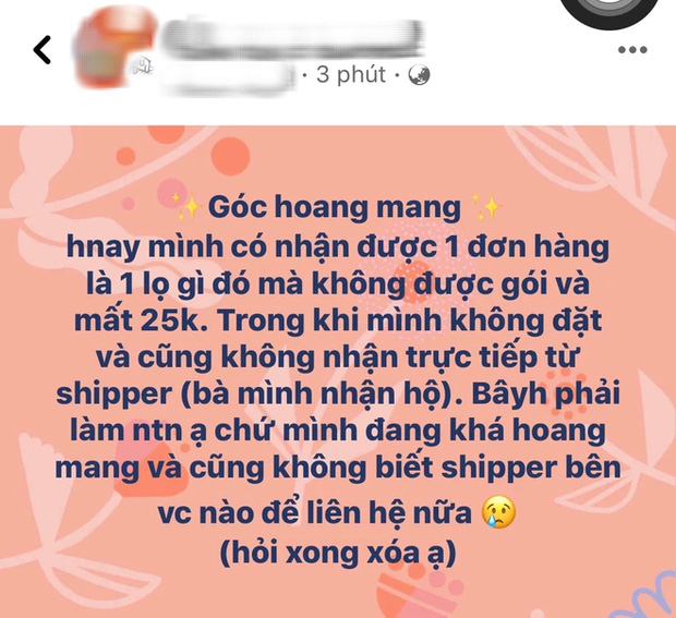 Một cô gái chia sẻ rằng, có nhận được 1 đơn hàng không rõ là sản phẩm gì và được thông báo mất phí ship 25k. Cô cũng chia sẻ thêm thông tin người nhận đúng là mình nhưng bản thân lại chưa hề đặt đơn hàng như vậy. Lập tức, nhiều chị em đã vào bình luận và chia sẻ mình cũng từng gặp những trường hợp tương tự. Nhiều người cũng cho hay, điều này có thể là do trong quá trình mua sắm online bản thân đã để lộ thông tin cá nhân.