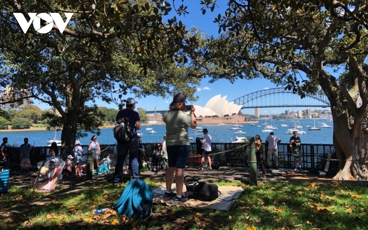 Vì Covid-19 nên số người tụ tập ở khu vực xem pháo hoa đẹp nhất thành phố Sydney - Mrs Macquarie's Chair, không đông như mọi năm. Ảnh: VOV.