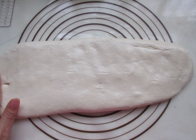 Buổi sáng, lấy bột ra khỏi âu, không cần nhào lại mà trực tiếp cán bột thành dải dài.