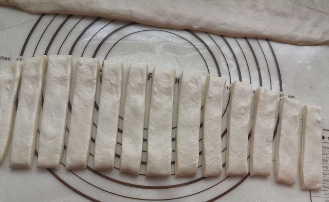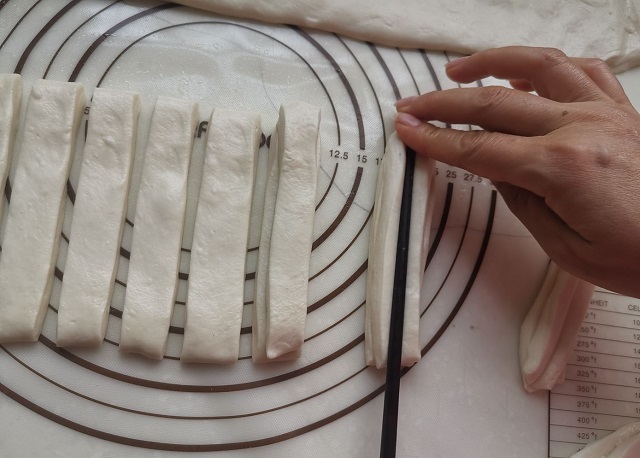 Sau đó, dùng dao cắt bột thành những dải rộng khoảng 1cm (có thể thay đổi kích thước của dải bột to hay bé hơn tùy theo sở thích).