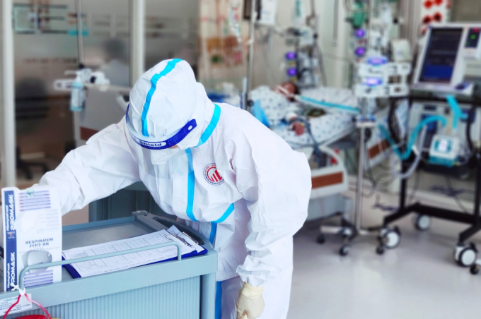 Nhân viên y tế điều trị cho một bệnh nhi đồng nhiễm Covid-19 và sốc sốt xuất huyết hồi tháng 9/2021. Ảnh: Bệnh viện Nhi đồng Thành phố