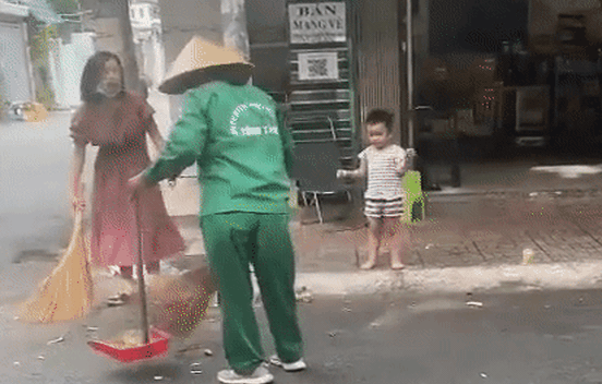 Cô gái mặc váy hồng nói: "Cô hốt đi, cháu quét cho cô rồi", "Cô sai chứ cháu không có sai đâu. Cháu nói rất nhẹ nhàng. Cô đừng quét vô hiên nhà cháu nữa". Tuy nhiên, nữ công nhân vẫn tỏ ra khó chịu, tiếp tục hất rác, bụi vào nhà người dân rồi bỏ đi.