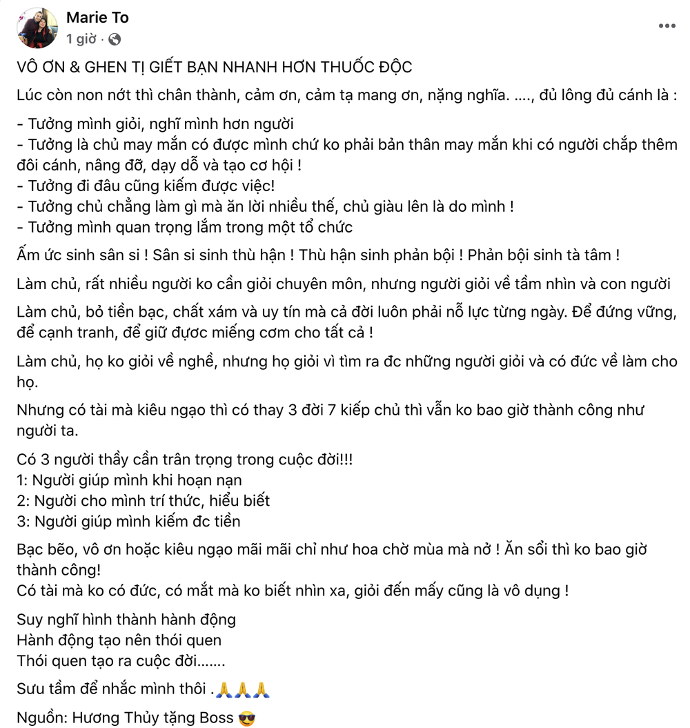 "T. đăng status này không với mục đích ám chỉ ai hết vì thấy hay nên share. Mình không muốn tai tiếng xảy ra với mình thì cũng đừng gieo tiếng oán cho ai hết. Sống làm sao mà tối đặt lưng xuống không suy nghĩ, vướng bận chuyện gì mình đã làm và ai đã làm gì đối với mình. Đi gặp bất cứ ai vẫn ngẩng mặt nhìn, thế thôi", bà Marie viết.