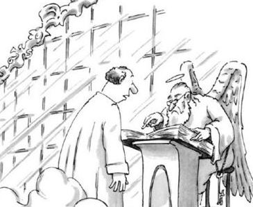 Trước cổng thiên đàng, Thánh Peter đang tra cuốn sổ lớn xem người vừa đến có xứng đáng được chấp nhận không. Sau mộthồi, Thánh nhíu mày nói: