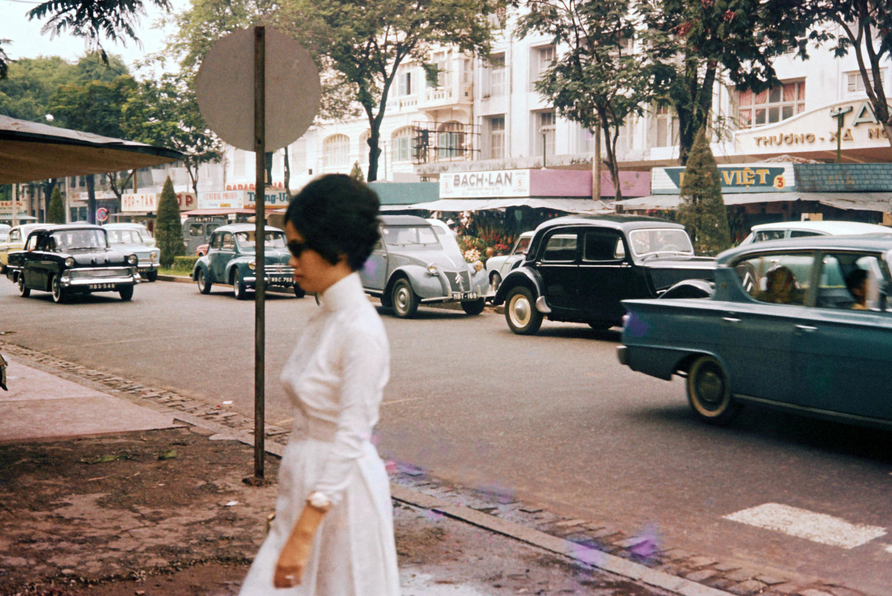 Cô nữ sinh trung học với áo dài trắng bên đường Phạm Ngũ Lão, phía xa là tòa nhà trên đường Hàm Nghi