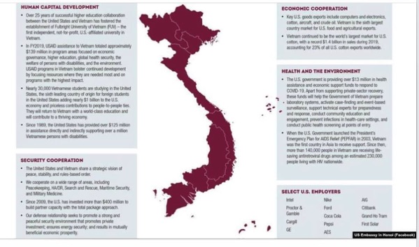 Mỹ chưa bao giờ công khai ủng hộ các tuyên bố chủ quyền của Việt Nam đối với các quần đảo Hoàng Sa và Trường Sa nhưng trong một đăng tải trên trang chính thức của Sứ quán Mỹ. Một bản đồ Việt Nam với hai quần đảo này được đăng kèm theo các thông tin về sự hợp tác giữa Hoa Kỳ và Việt Nam.