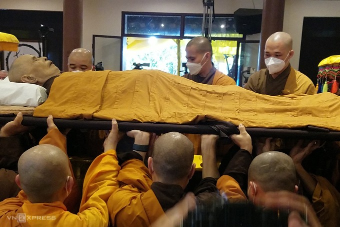 Thi hài thiền sư Thích Nhất Hạnh được đặt vào linh cữu sáng 23/1. Ảnh: Võ Thạnh