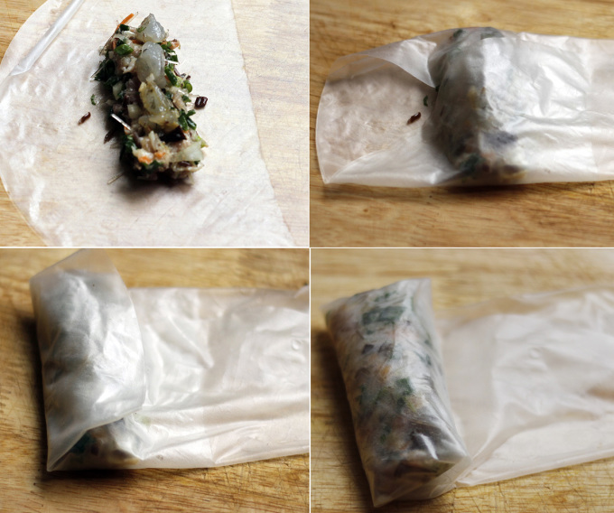 Gói nem vừa tay, đừng chặt tay quá sẽ bị vỡ khi chiên do nhân nở ra.