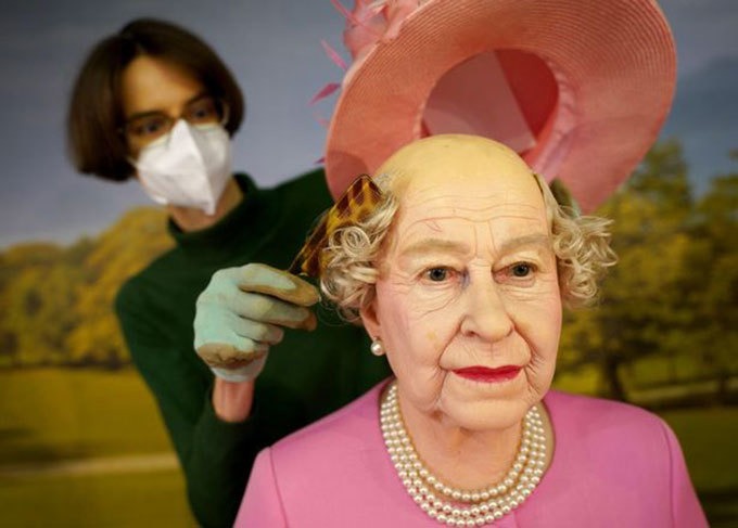 Nhân viên bảo tàng Panoptikum chăm sóc bức tượng sáp bị hói của Nữ hoàng Elizabeth II. Ảnh: Alamy Live News