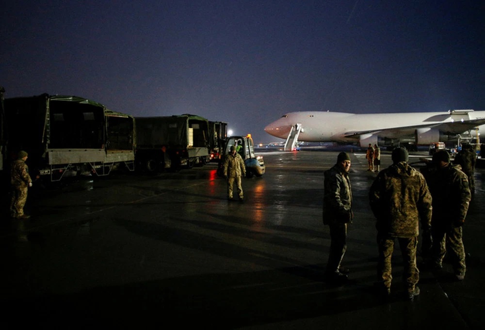 Hàng viện trợ quân sự của Mỹ đến sân bay ở ngoại ô thủ đô Kiev - Ukraine hôm 5-2. Ảnh: Reuters