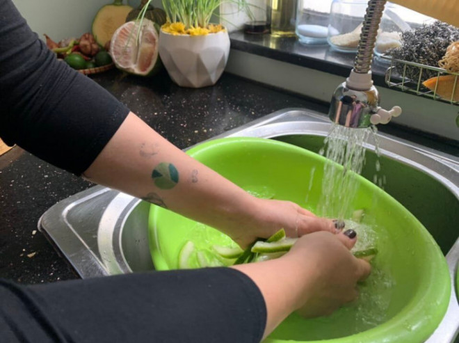Sau đó cho vào thau nước 3 thìa muối và bóp phần cùi bưởi, lặp đi lặp lại khoảng 4-5 lần đến khi thấy nước trong thì vắt khô.