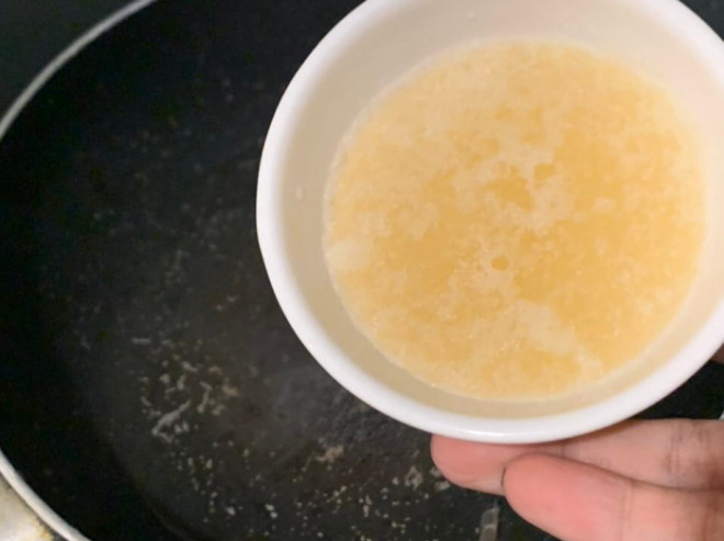 Đun nhỏ lửa đến khi đường tan, sôi lăn tăn thì tắt bếp rồi đổ ra 1 cái khuôn.