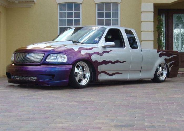 Ngược lại với trường hợp “chân dài” ở trên, chiếc bán tải này lại được độ phần body-kit, mặt ca-lăng và sơn lại theo hình ngọn lửa màu tím. Đáng chú ý là chiếc bán tải này được hạ gầm một cách “thô thiển”, trông không khác nào một ngọn lửa đang bò dưới đất.
