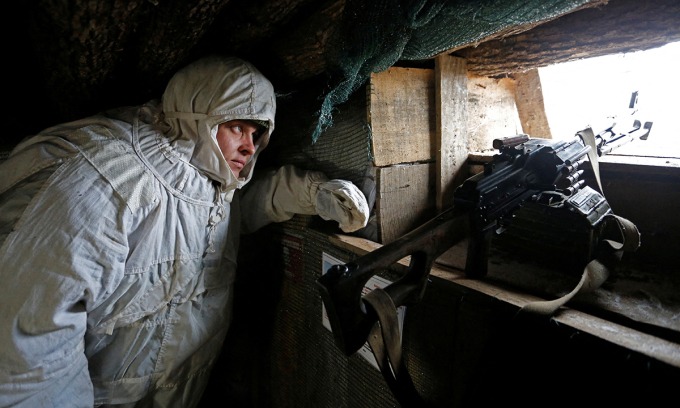 Thành viên lực lượng ly khai ở Donetsk đứng gác trong công sự gần khu dân cư Yasnoye, Ukraine ngày 14/1. Ảnh: Reuters.