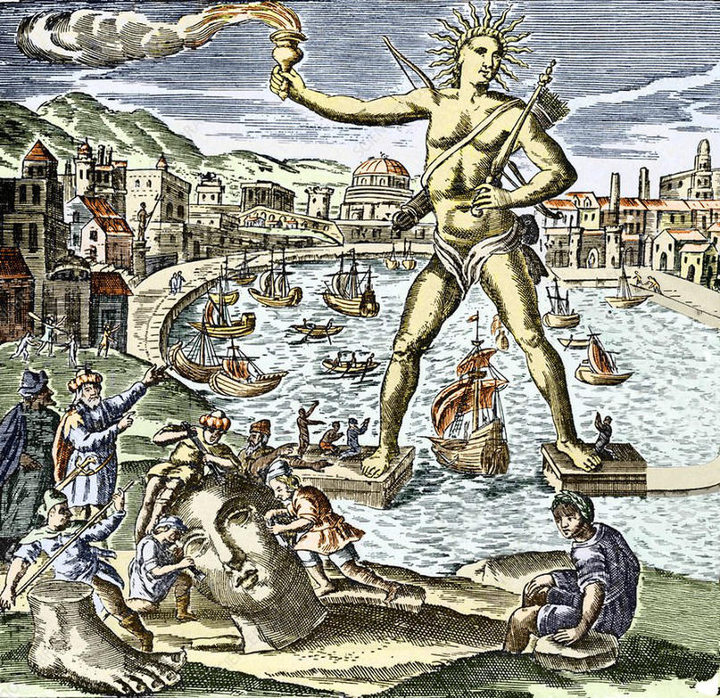 Bức tượng được xây dựng ở Rhodes, một hòn đảo của Hy Lạp nằm tại phía đông nam biển Aegean. Bức tượng được xây dựng để vinh danh Helios - vị thần Mặt Trời trong Thần Thoại Hy Lạp và cũng là người bảo hộ cho hòn đảo này. Được xây dựng từ năm 292 - 280 TCN, bức tượng có chiều cao khoảng 34m và được làm hoàn toàn bằng đồng thau.