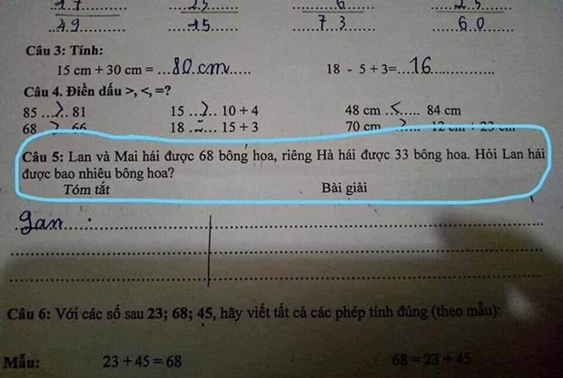 Xuất hiện trên mạng xã hội gần đây là một bài như vậy, nhìn tưởng đơn giản nhưng vô cùng khó: Lan và Mai hái được 68 bông hoa, riêng Hà hái được 33 bông hoa. Hỏi Lan hái được bao nhiêu bông hoa?