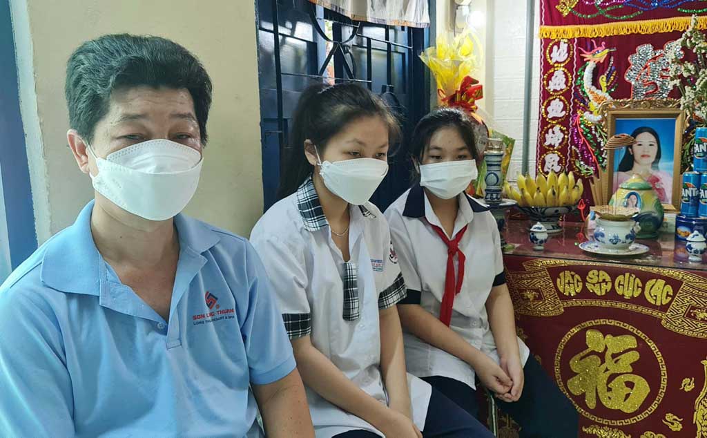 Hai cháu Uyên Phương, Uyên Nhi và người cha bệnh tật bên bàn thờ người mẹ qua đời vì Covid-19