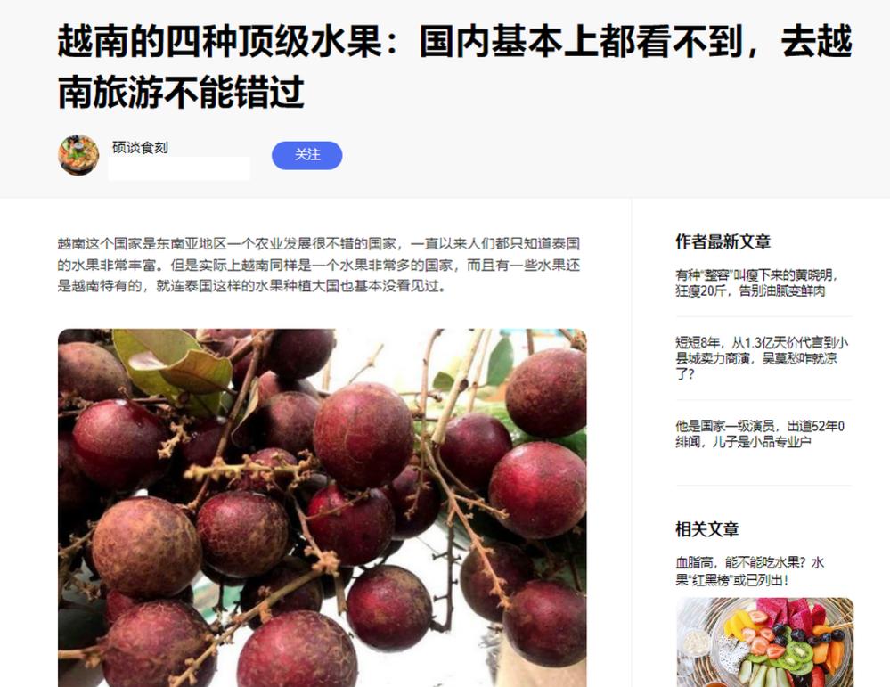"Việt Nam là nước có nền nông nghiệp rất phát triển trong khu vực Đông Nam Á. Người Trung Quốc thường chỉ biết trái cây Thái Lan rất đa dạng. Nhưng trên thực tế, Việt Nam cũng là nước trồng nhiều trái cây. Trong đó, một số loại trái cây chỉ có ở Việt Nam, ngay cả tại "Cường quốc trái cây" Thái Lan cũng chưa từng thấy".