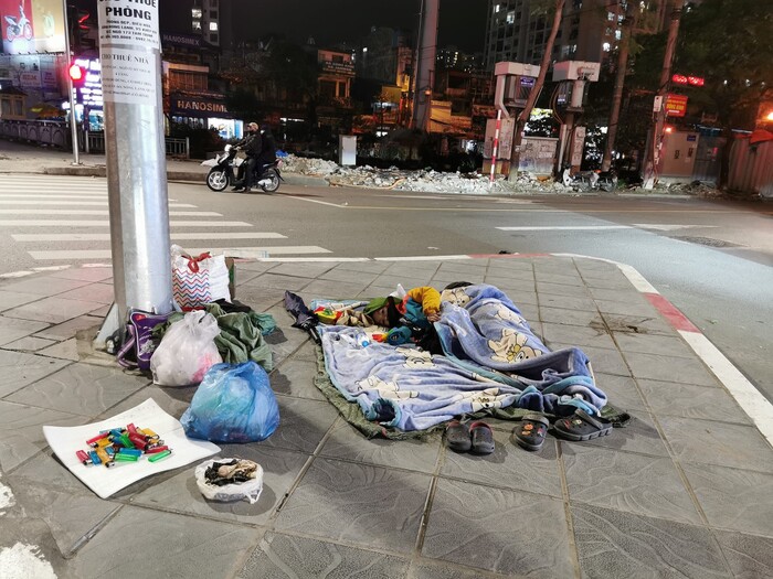 “Trời Hà Nội còn có 10*C, gió thổi lộng cả óc, thế mà 2 em bé này nằm lăn lóc ở đây, ngay chính giữa ngã 4 cầu Mai Động, để một người phụ nữ (có vẻ là mẹ) bán bật lửa. Thật khó nghĩ...".