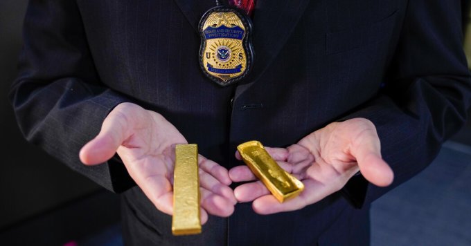 Đặc vụ Mỹ cầm trên tay hai thỏi vàng trong số cổ vật trả lại cho Pháp. Ảnh: AFP.