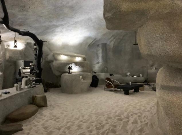 Phía bên trong hang đá được rải ngập cát, không khí mát mẻ. Nội thất của hang được tạo thành từ các phiến đá chồng lên nhau. Bên trong có các vật dụng đơn giản như bàn ghế, đèn báo bão, đồ dùng và máy móc pha cà phê...