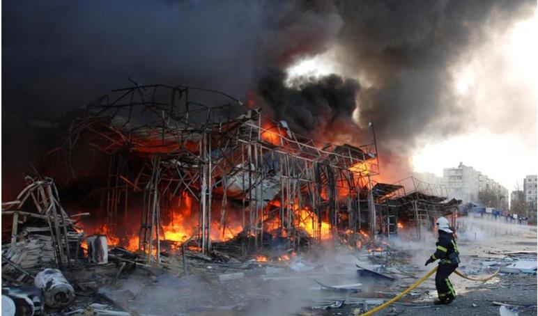 Những hình ảnh do truyền thông công bố đã cho thấy mức độ tàn phá tại các thành phố ở Ukraine sau 3 tuần Nga triển khai chiến dịch quân sự. Trong ảnh: Lính cứu hỏa khống chế đám cháy sau cuộc giao tranh tại Kharkov (Ảnh: Reuters).