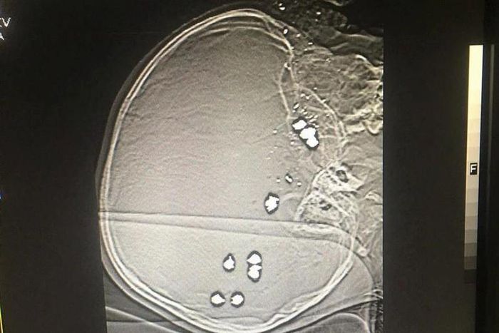 Hình ảnh chụp X-quang cho thấy cháu bé bị nhiều viên đạn găm vào đầu (Ảnh: Bệnh viện Sản Nhi tỉnh Ninh).