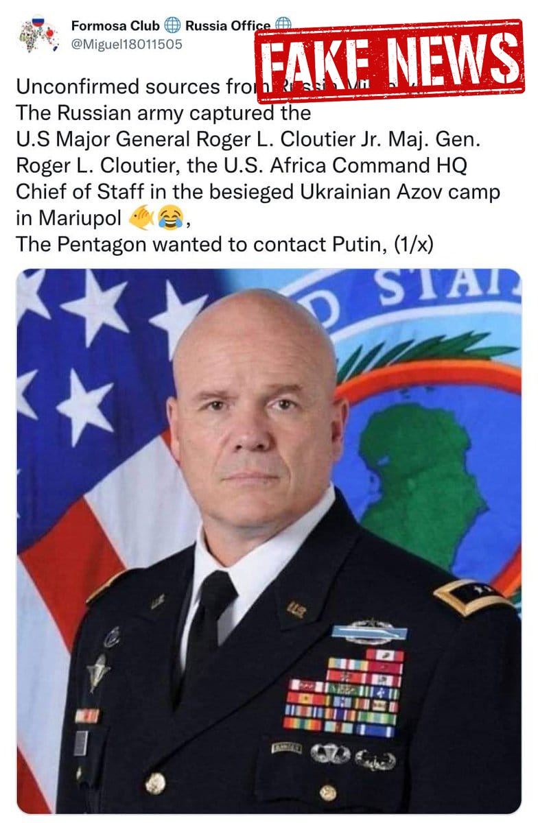 Từ ngày 5.4, nhiều trang mạng xã hội chia sẻ hình ảnh tướng Cloutier kèm nội dung “Rộ tin thiếu tướng quân đội Mỹ Roger L. Cloutier đã bị quân đội Nga bắt tại khu vực Azovstal ở Mariupol”. Kèm theo đó, các trang mạng còn thông tin rằng Washington đang tìm cách đàm phán với Moscow để “chuộc” tướng Cloutier.Tuy nhiên, thông tin trên cũng đã bị một số trang mạng khác phản bác và cho rằng đó là “tin giả”.