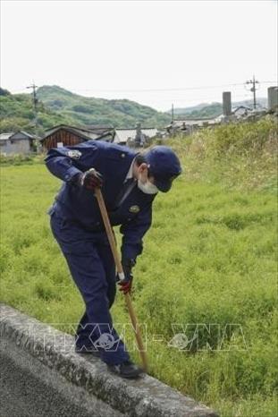 Cảnh sát tìm kiếm con trăn bị xổng trong bãi cỏ xung quanh khu căn hộ ở thành phố Okayama, Nhật Bản ngày 18/4/2022. Ảnh: Kyodo/TTXVN
