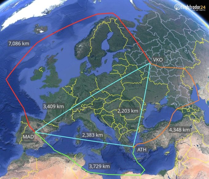 Cụ thể, máy bay ban đầu khởi hành từ Moskva tới Tây Ban Nha. Quãng bay này thông thường chỉ dài 3.409 km, song máy bay Nga phải đi vòng 7.086 km vì luôn phải duy trì trong không phận quốc tế.