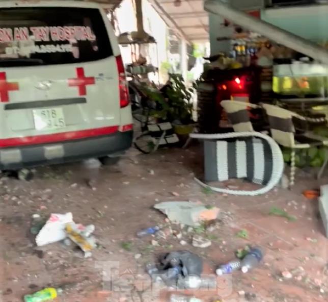 Xe cứu thương hư hỏng nặng phần đầu, trong khi bàn ghế trong quán cà phê bị đổ bể. Người dân cho hay, thời điểm xảy ra tai nạn trên xe cứu thương không có bệnh nhân và tài xế bị thương nhẹ. Ghi nhận cho thấy, trên thân xe cứu thương ghi “phòng khám đa khoa Sài Gòn An Tây”.